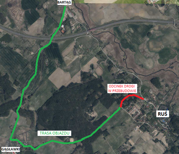 Planowane czasowe zamknięcie drogi na odcinku tzw. wąwozu (od posesji Ruś 1 do skrzyżowania z asfaltową drogą gminną). Zalecany objazd przez miejscowość Gągławki.
