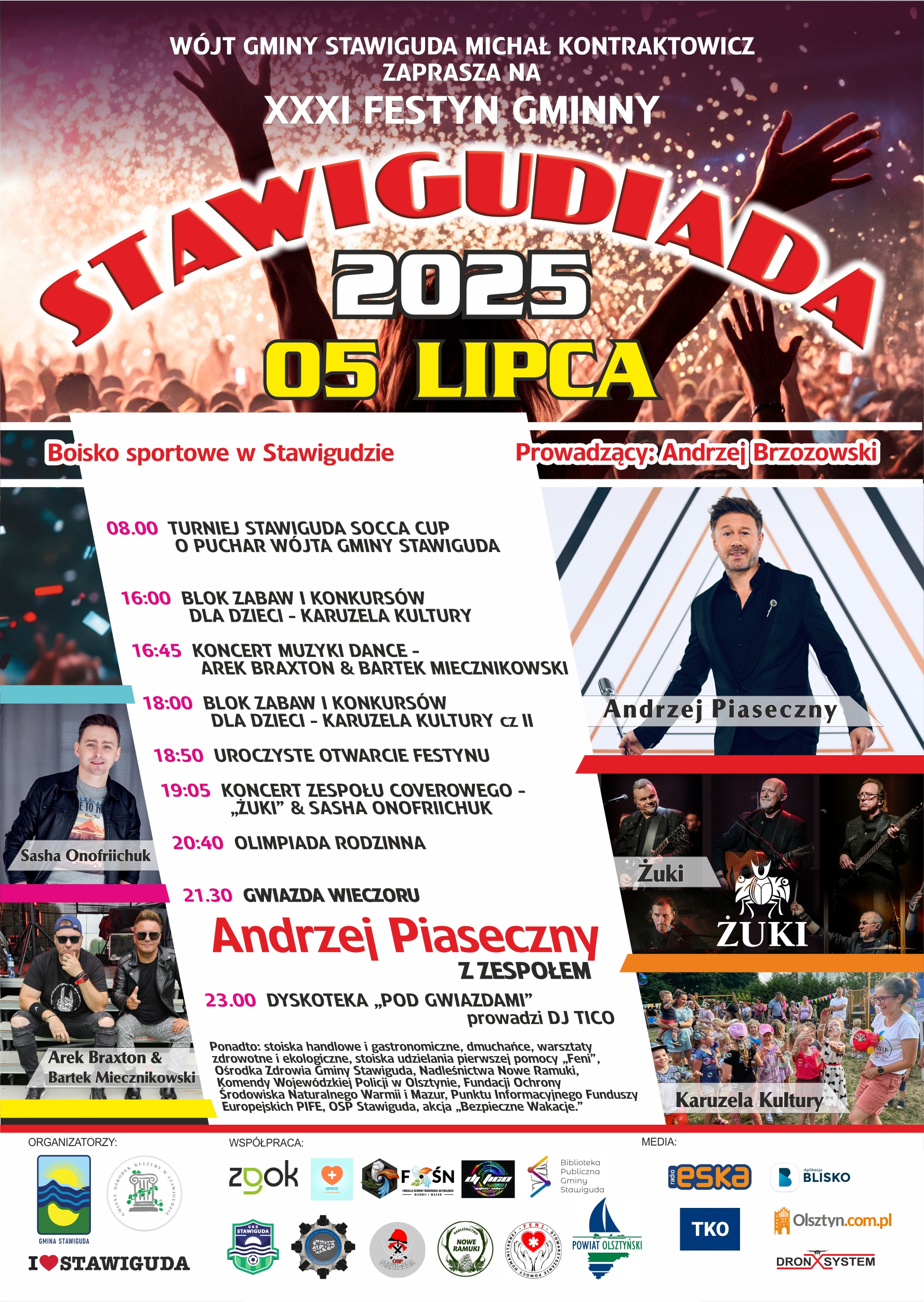 Już 5 lipca zabierzemy Was prawie do nieba. A dokładnie zrobi to autor tych słów - Andrzej Piaseczny, bo to on będzie gwiazdą naszej XXXI Stawigudiady. Wspólnie zadeklarujemy też „Budzikom śmierć”, bo atrakcji tego dnia nie zabraknie. Ale zanim Andrzej Piaseczny, na naszej scenie zagra Arek Braxton znany z takich piosenek jak "Na Falochronie 2k24", "Au Sza La laLa", "Tropikalna" czy "Ona Niebezpieczna" oraz wyjątkowe połączenie klasycznego rocka z charyzmatycznym wokalem młodego artysty, czyli Zespół Żuki & Sasha Onofriichuk. Tradycyjnie już sporo będzie się działo nie tylko na scenie, ale także na licznych stoiskach naszych partnerów.