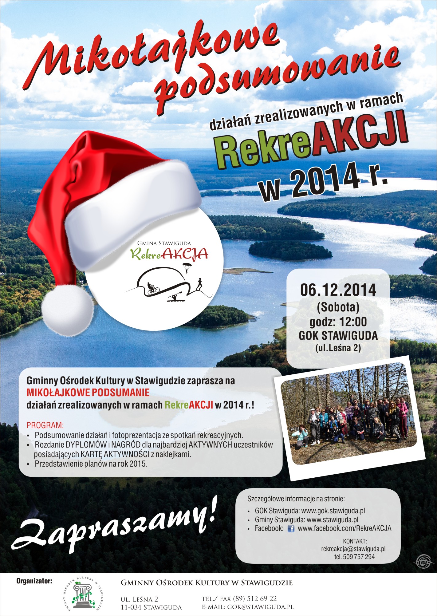 W sobotę 6 grudnia 2014 r. o godzinie 12:00 w Gminnym Ośrodku Kultury w Stawigudzie (ul. Leśna 2) odbędzie się Mikołajkowe PODSUMOWANIE działań zrealizowanych w ramach RekreAKCJI w 2014 r.