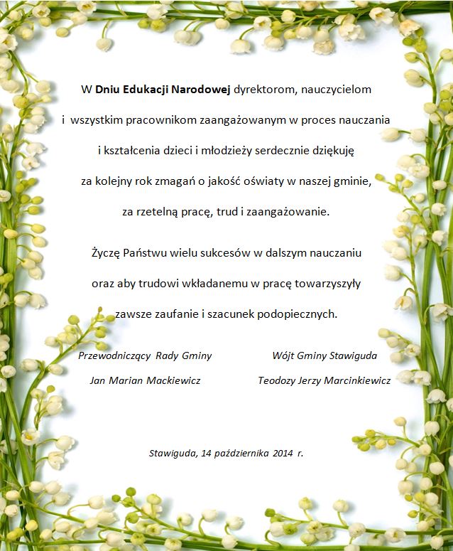 W Dniu Edukacji Narodowej dyrektorom, nauczycielom i wszystkim pracownikom zaangażowanym w proces nauczania i kształcenia dzieci i młodzieży serdecznie dziękuję za kolejny rok zmagań o jakość oświaty w naszej gminie, za rzetelną pracę, trud i zaangażowanie. Życzę Państwu wielu sukcesów w dalszym nauczaniu oraz aby trudowi wkładanemu w pracę towarzyszyły zawsze zaufanie i szacunek podopiecznych.