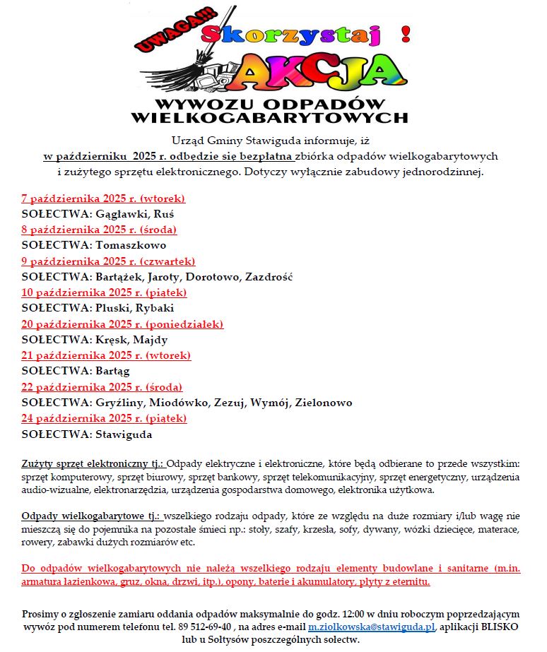 Urząd Gminy Stawiguda informuje, że w październiku 2025 r. odbędzie się bezpłatna zbiórka odpadów wielkogabarytowych i zużytego sprzętu elektronicznego. Informacja dotyczy wyłącznie zabudowy jednorodzinnej.