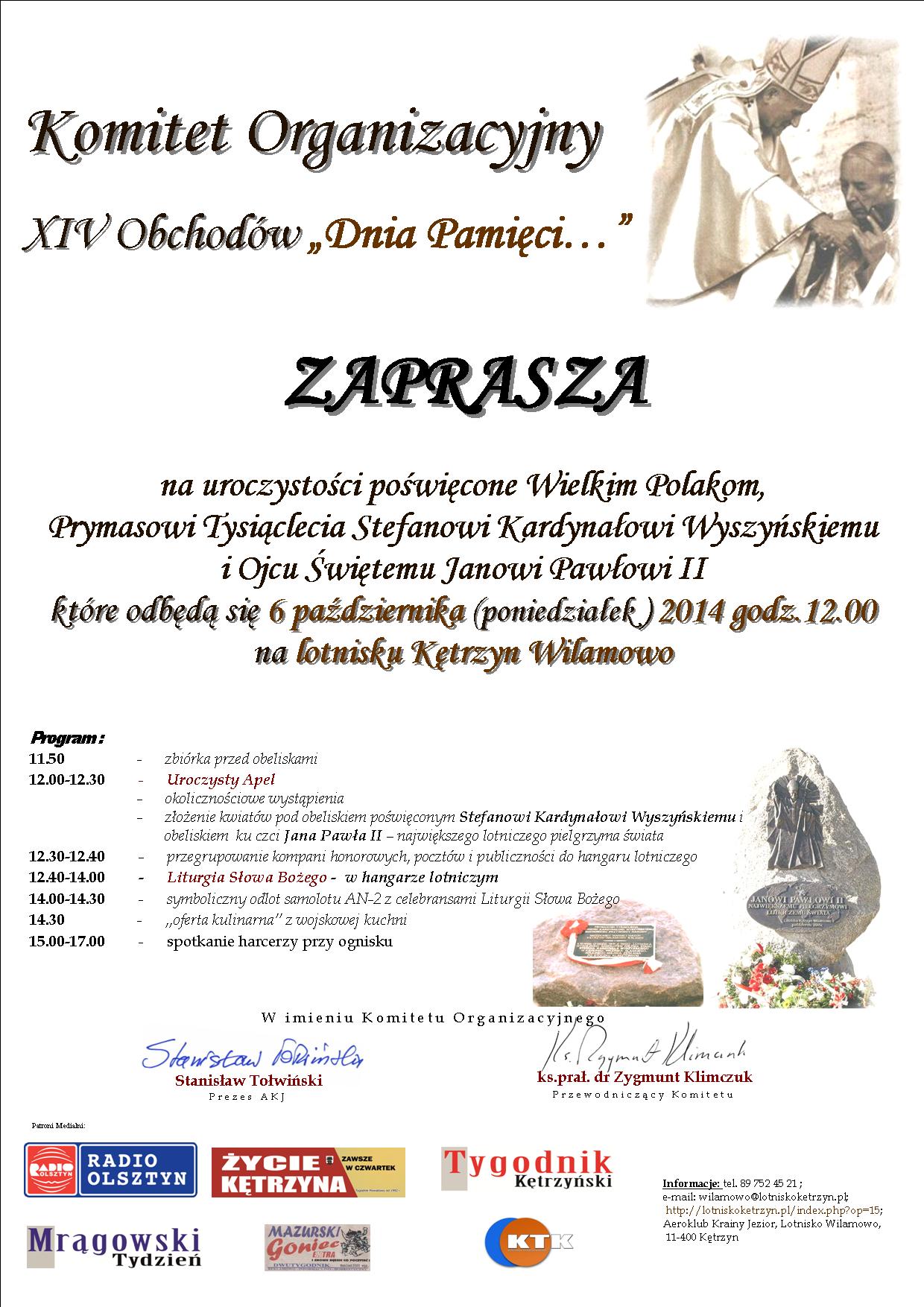 Komitet Organizacyjny Obchodów Dnia Pamięci Stefana Kardynała Wyszyńskiego i Jana Pawła II zaprasza na uroczystości poświęcone Wielkim Polakom Prymasowi Tysiąclecia i Ojcu Świętemu, które odbędą się w dniu 3 października (piątek) 2014 r. o godz.16.30 w Stoczku Klasztornym – Sanktuarium Matki Pokoju a 6 października (poniedziałek) 2014 r. o godz.12.00 na Lotnisku Kętrzyn Wilamowo.