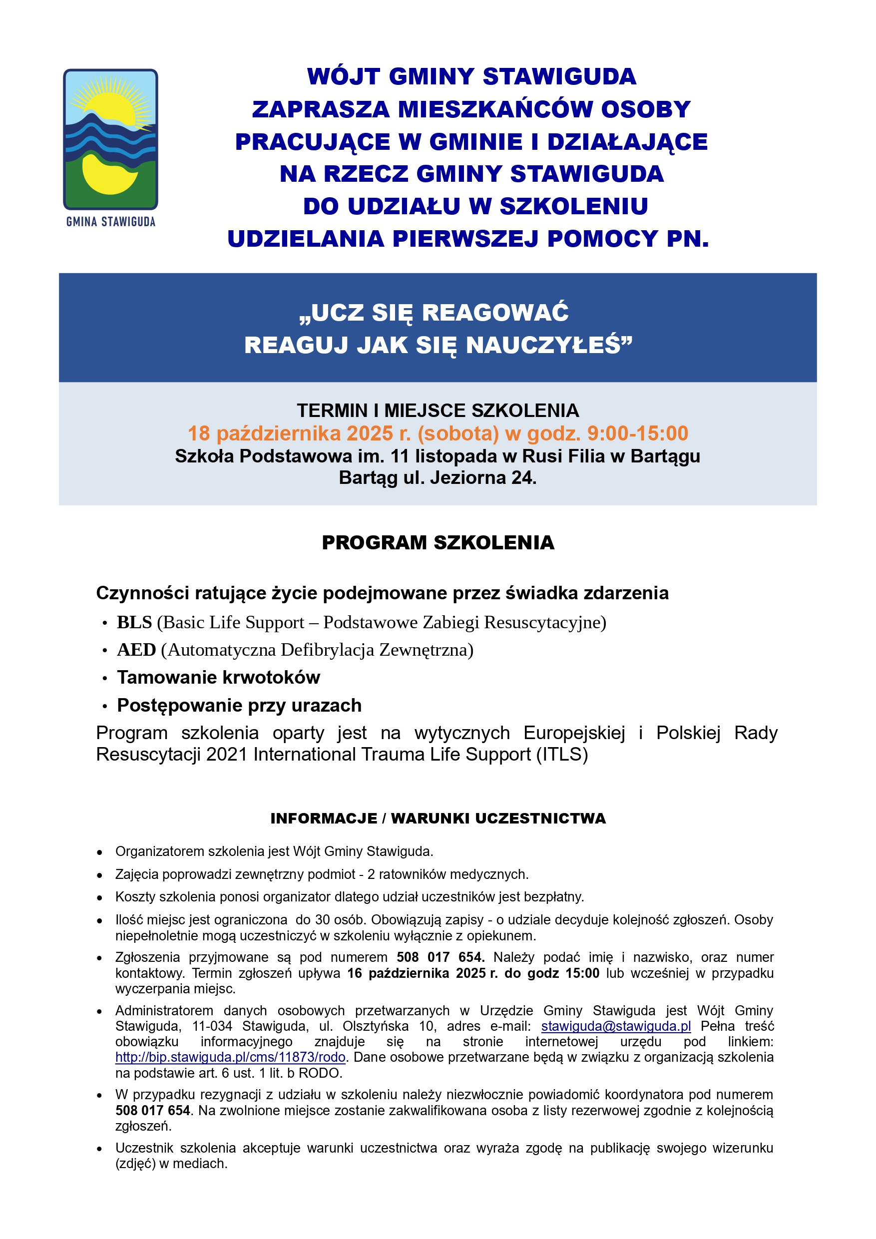 Zapraszamy mieszkańców oraz osoby pracujące i działające na rzecz Gminy Stawiguda do udziału w szkoleniu z zakresu udzielania pierwszej pomocy.