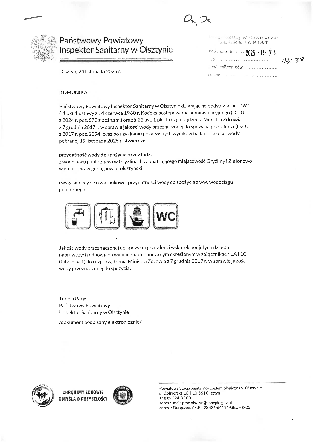 Urząd Gminy Stawiguda przekazuje do wiadomości komunikat Inspekcji Sanitarnej w sprawie przydatności wody do spożycia w miejscowościach Gryźliny i Zielonowo. Woda jest całkowicie przydatna do spożycia. Za utrudnienia przepraszamy.