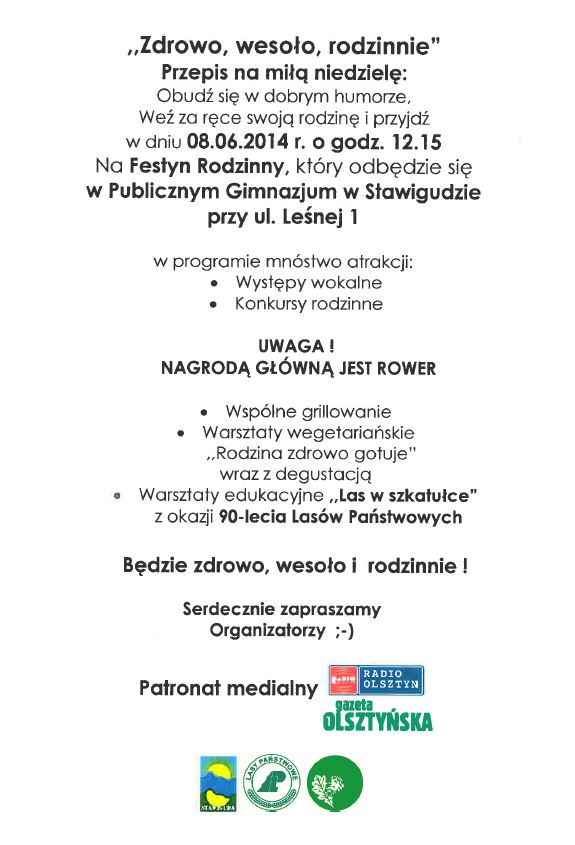 Obudź się w dobrym humorze, weź za ręce swoją rodzinę i przyjdź w dniu 08.06.2014 r. o godz. 12.15 na Festyn Rodzinny, który odbędzie się w Publicznym Gimnazjum w Stawigudzie przy ul. Leśnej 1.