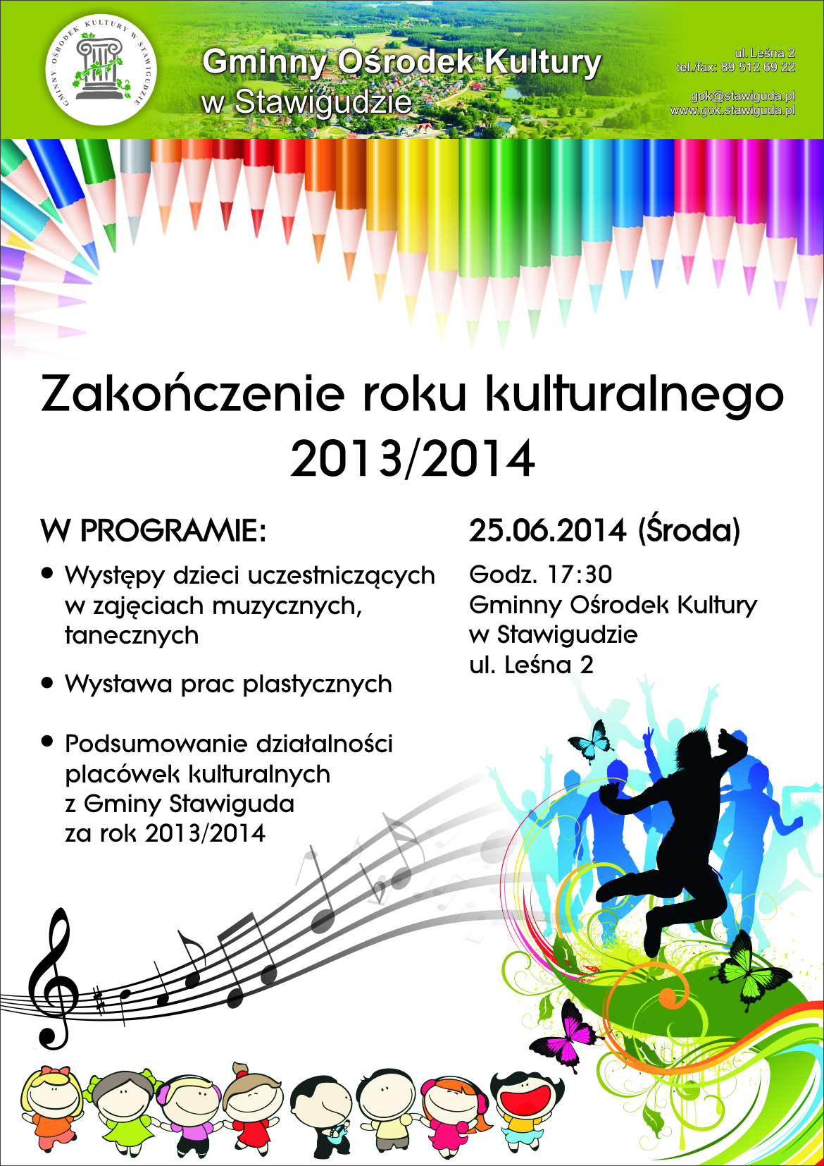 Gminny Ośrodek Kultury w Stawigudzie zaprasza na oficjalne zakończenie roku kulturalnego 2013/2014, które odbędzie się 25 czerwca 2014 r. w placówce GOK (ul. Leśna 2) o godzinie 17:30.