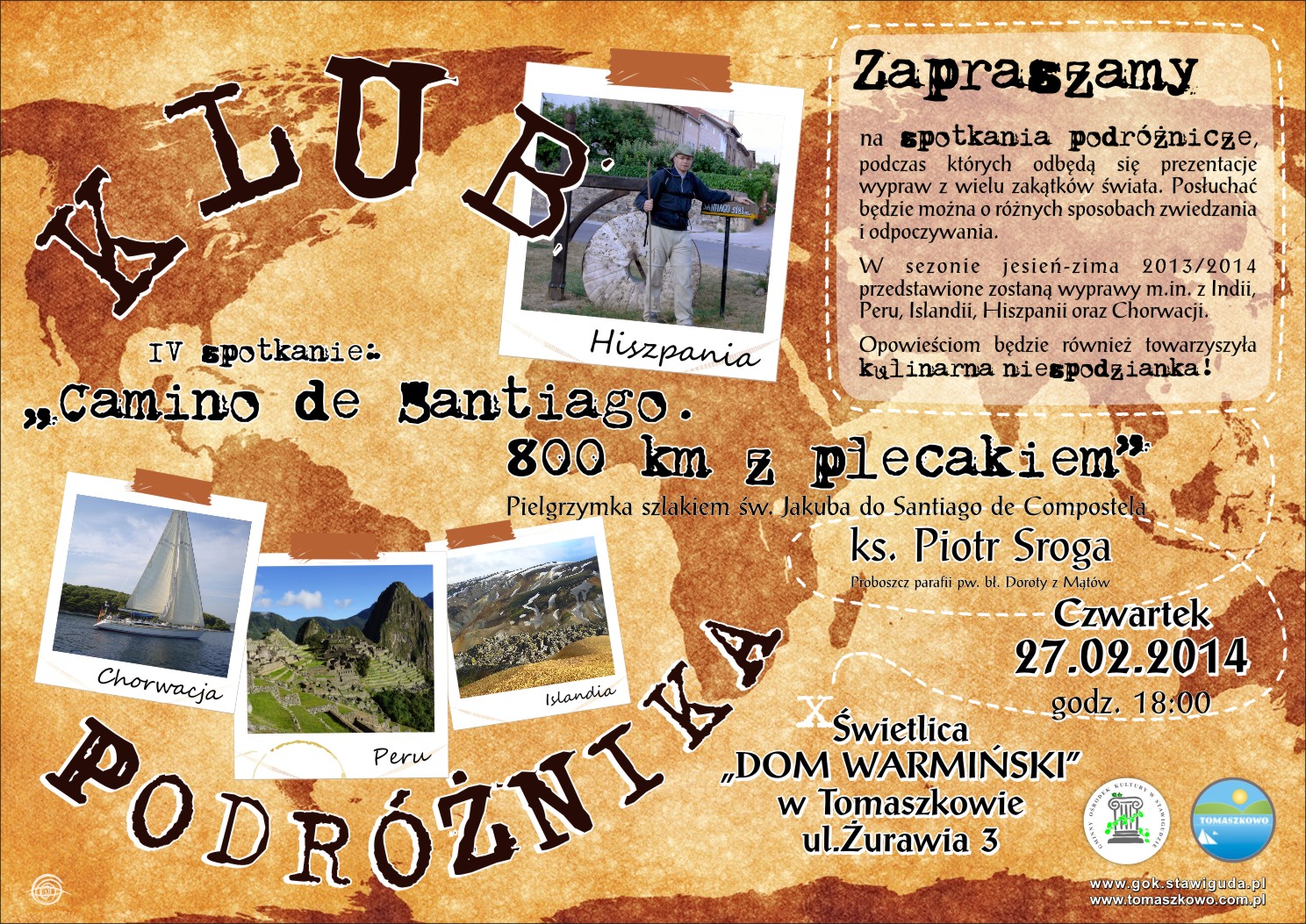 Serdecznie zapraszamy na kolejne spotkanie Klubu Podróżnika, które odbędzie się w czwartek 27 lutego 2014 r. o godzinie 18:00 w świetlicy w Tomaszkowie. Zaprezentowana zostanie relacja z pielgrzymki ks. Piotra Srogi szlakiem św. Jakuba do Santiago de Compostela.