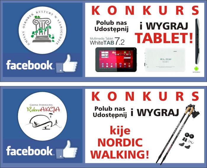 Gminny Ośrodek Kultury w Stawigudzie zaprasza do uczestnictwa w KONKURSACH Facebook'owych. Do wygrania TABLET i KIJE NORDIC WALKING!