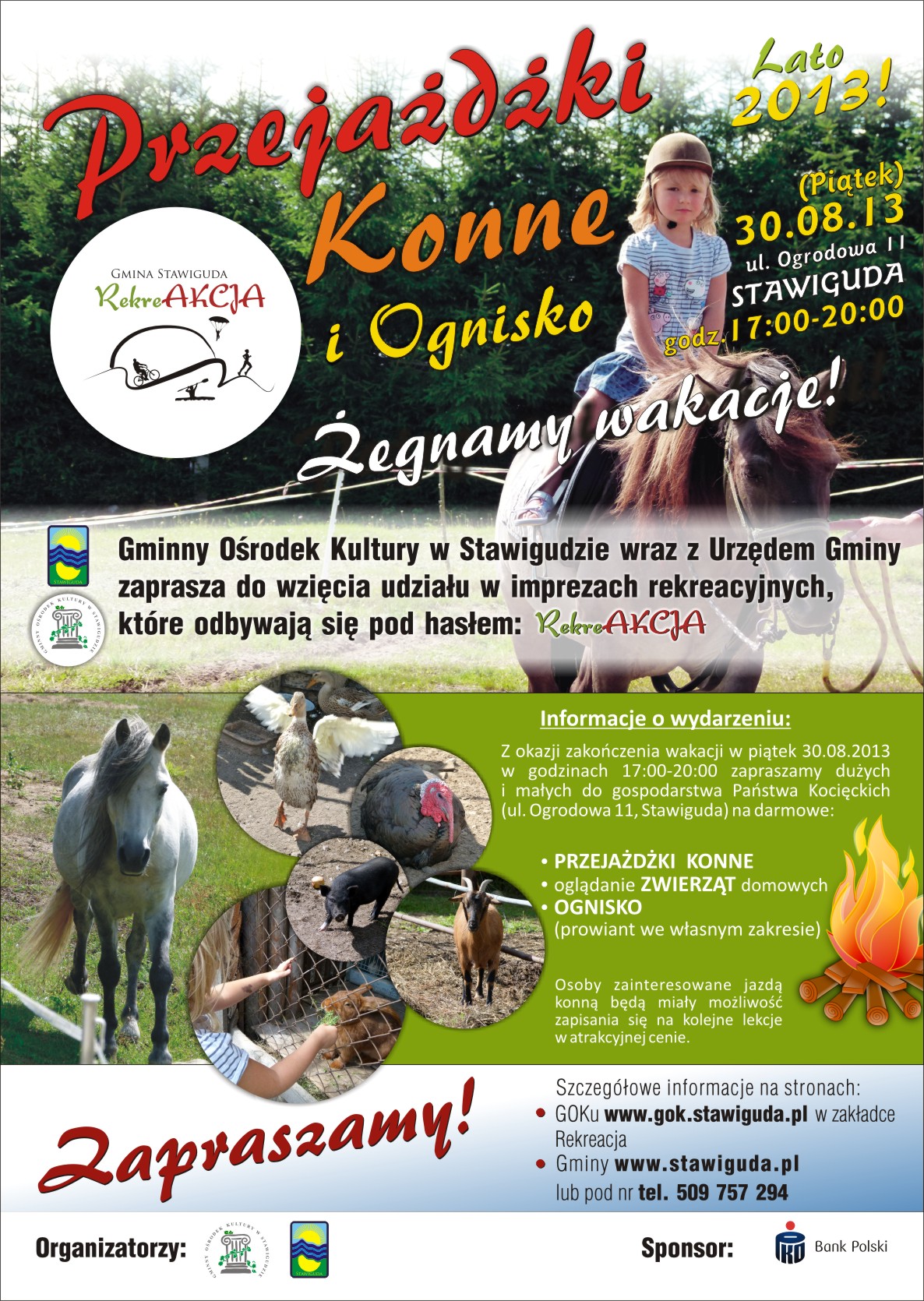 Z okazji zakończenia wakacji w piątek 30 sierpnia 2013 w godzinach 17:00-20:00 zapraszamy dużych i małych do gospodarstwa Państwa Kocięckich na darmowe przejażdżki konne, oglądanie zwierząt domowych oraz ognisko!