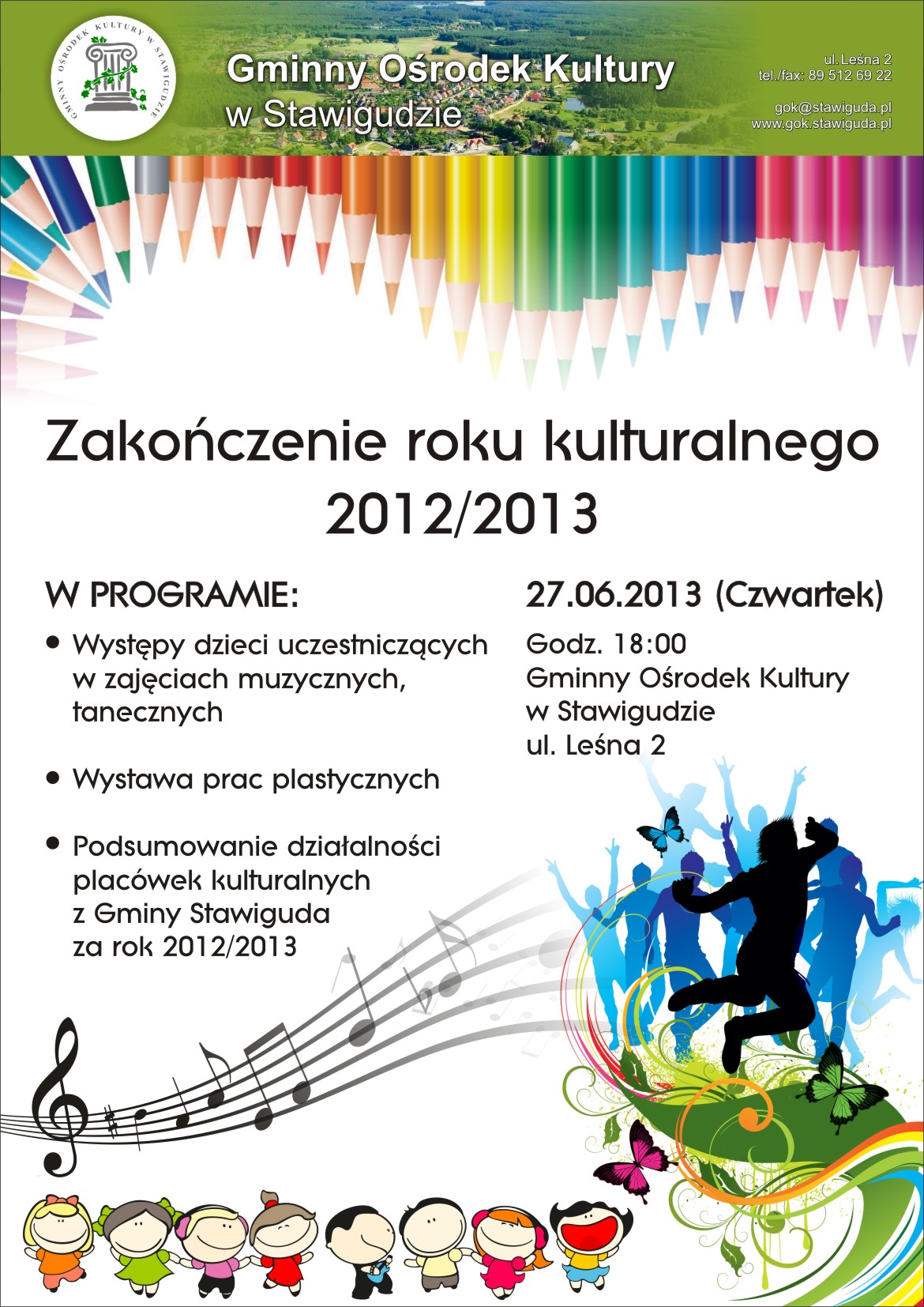 Zapraszamy na zakończenie roku kulturalnego 2012/2013, który odbędzie się 27.06.2013 o godzinie 18:00 w Gminnym Ośrodku Kultury w Stawigudzie.