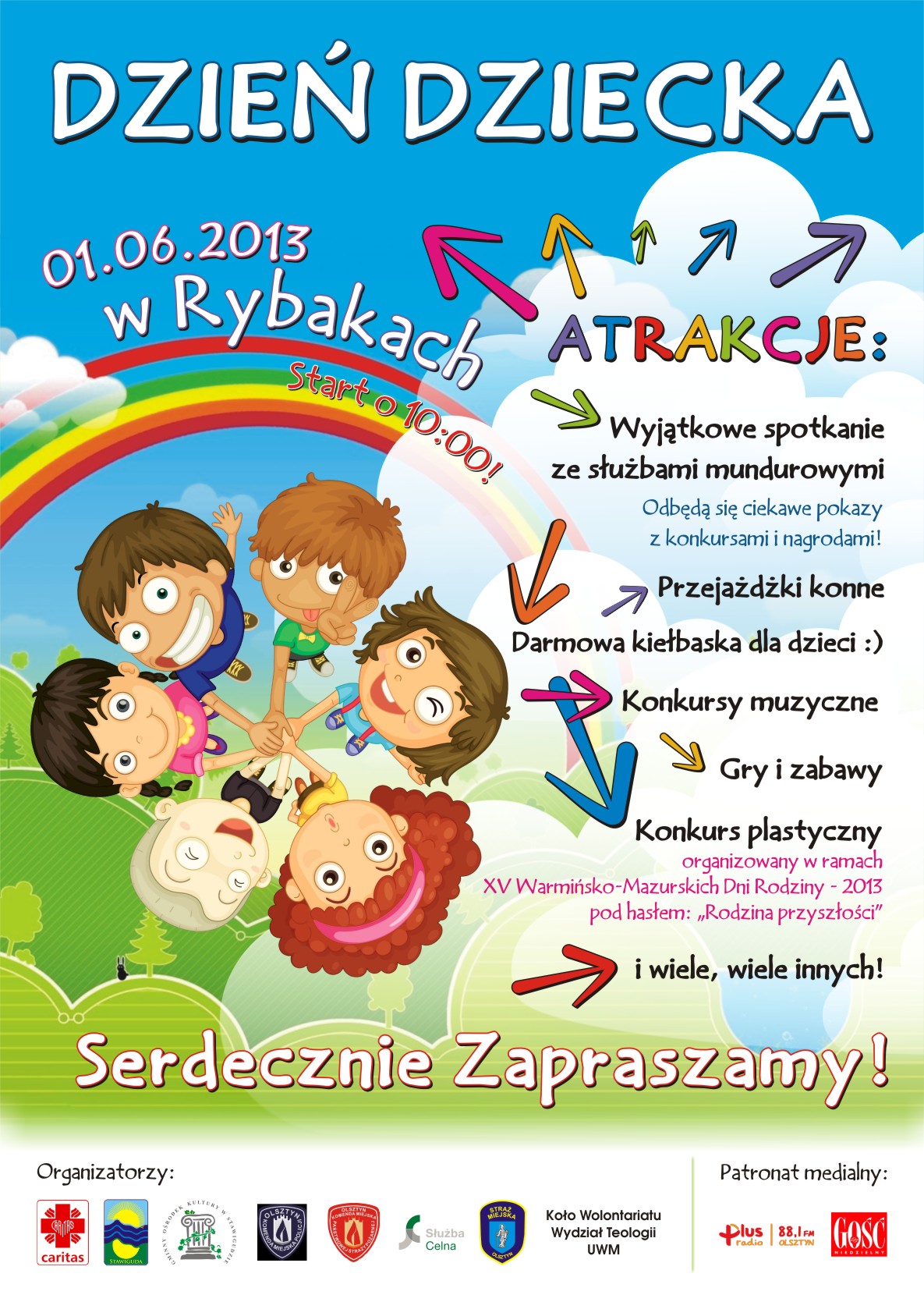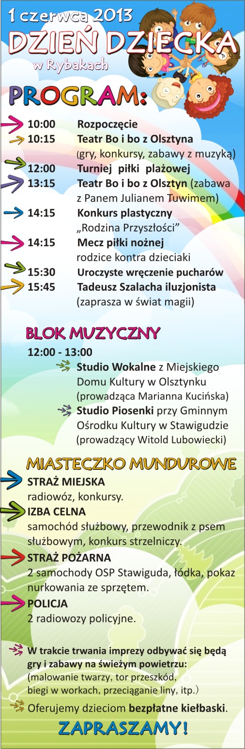 Zapraszamy serdecznie na piknik organizowany z okazji Dnia Dziecka. 01.06.2013 w Rybakach o godzinie 10:00 startujemy z atrakcjami, konkursami i dobrą zabawą!