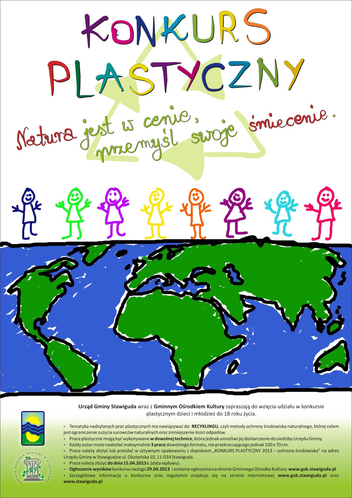 Urząd Gminy Stawiguda wraz z Gminnym Ośrodkiem Kultury zapraszają na KONKURS PLASTYCZNY dla dzieci i młodzieży do 18 roku życia pod hasłem: „Natura jest w cenie, przemyśl swoje śmiecenie”.