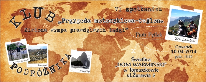 W czwartek 10 kwietnia 2014 w świetlicy w Tomaszkowie odbyło się już VI spotkanie w Klubie Podróżnika– tym razem piękną wyspę SRI LANKĘ (dawny Cejlon), poznaliśmy z relacji podróżników Piotra Pętlaka i Tomka Sarnowskiego, którzy w lutym tego roku podróżowali po wyspie w 5-cio osobowej grupie... motocyklami (Honda 250 i Bajaj 250).