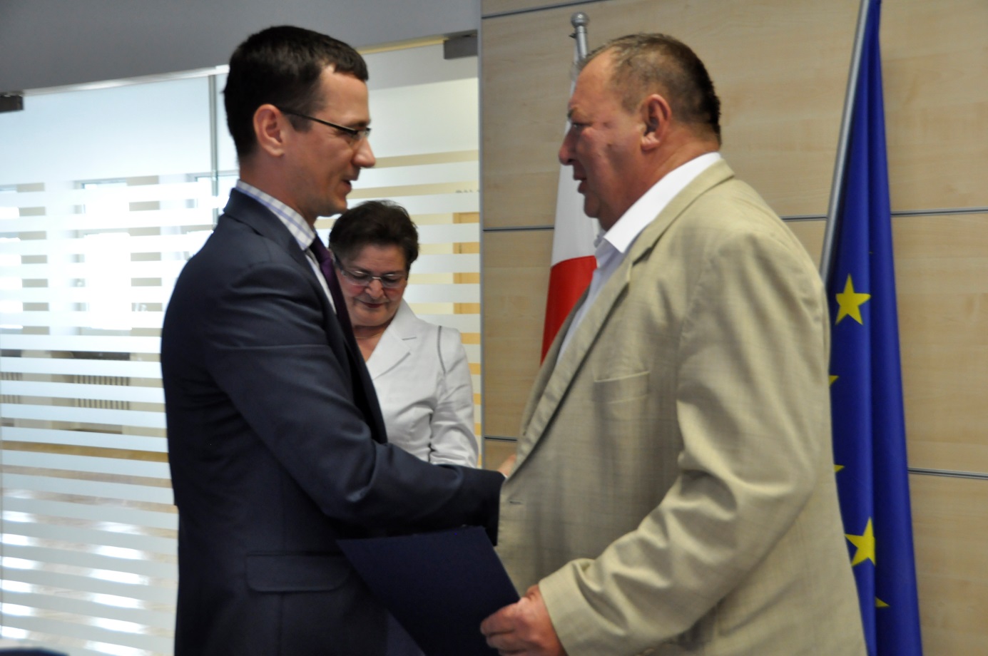Przewodniczący Wojewódzkiej komisji ds. oceny wniosków o dofinansowanie zadań w ramach programu wieloletniego pod nazwą „Narodowy program przebudowy dróg lokalnych – Etap II Bezpieczeństwo – Dostępność – Rozwój”, Dyrektor Wydziału Certyfikacji i Funduszy Europejskich Michał Kontraktowicz oraz Wójt Gminy Stawiguda Teodozy Jerzy Marcinkiewicz
