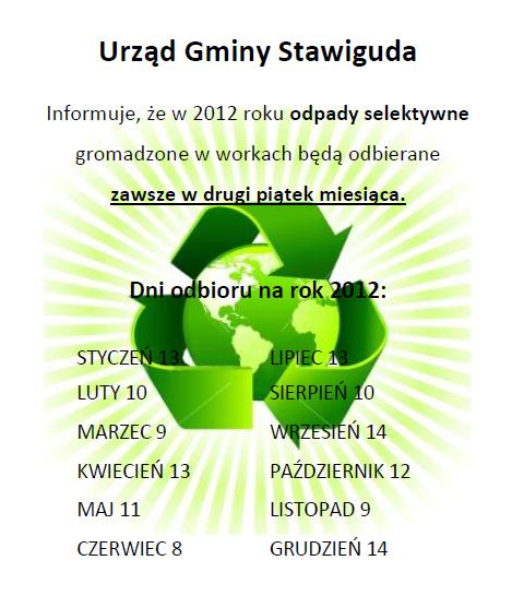 Urząd Gminy Stawiguda informuje, że w 2012 roku odpady selektywne gromadzone w workach będą odbierane zawsze w drugi piątek miesiąca.