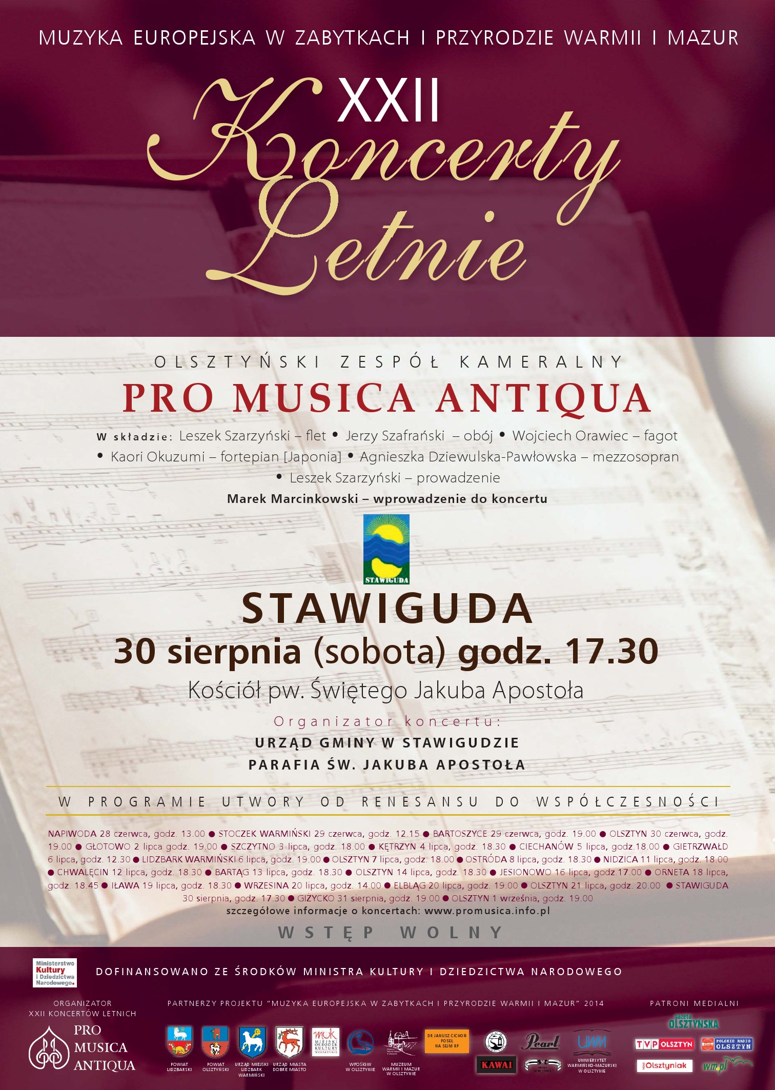 Tegoroczna edycja festiwalu odbędzie się w dniach 30-31 sierpnia. Pierwszego dnia w sobotę odbędzie się koncert towarzyszący zespołu kameralnego „Pro Musica Antiqua” z Olsztyna pod dyrekcją prof. Leszka Szarzyńskiego w kościele w Stawigudzie o godzinie 17:30.
