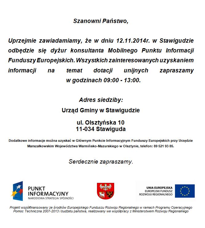 Uprzejmie zawiadamiamy, że w dniu 12.11.2014r.(środa) w Urzędzie Gminy Stawiguda odbędzie się dyżur konsultanta Mobilnego Punktu Informacji Funduszy Europejskich. Wszystkich zainteresowanych uzyskaniem informacji na temat dotacji unijnych zapraszamy w godzinach 9:00 - 13:00.