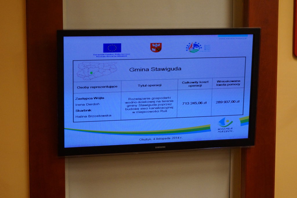 4 listopada 2014 r. w Urzędzie Marszałkowskim Województwa Warmińsko-Mazurskiego odpisano umowę na realizację operację: Rozwiązanie gospodarki wodno-ściekowej na terenie gminy Stawiguda poprzez budowę sieci kanalizacyjnej w miejscowości Ruś.
