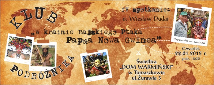 W czwartek 22 stycznia 2015 r. o godz. 18:30 rozpoczęła się wspaniała prezentacja Ojca Wiesława Dudara- Dyrektora Referatu Misyjnego Księży Werbistów w Pieniężnie pt. „W krainie rajskiego ptaka- Papua Nowa Gwinea”. Było to pierwsze w Nowym Roku spotkanie w KLUBIE PODRÓŻNIKA, które odbyło się w świetlicy wiejskiej „Dom Warmiński” w Tomaszkowie.