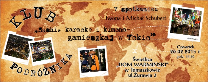 W czwartek 26 lutego 2015 r. o godzinie 18:30 odbyło się V spotkanie KLUBU PODRÓŻNIKA. Naszymi gośćmi byli Iwona i Michał Schubertowie, którzy opowiedzieli o swoim kilkumiesięcznym pobycie z małym dzieckiem w stolicy Japonii- Tokio.