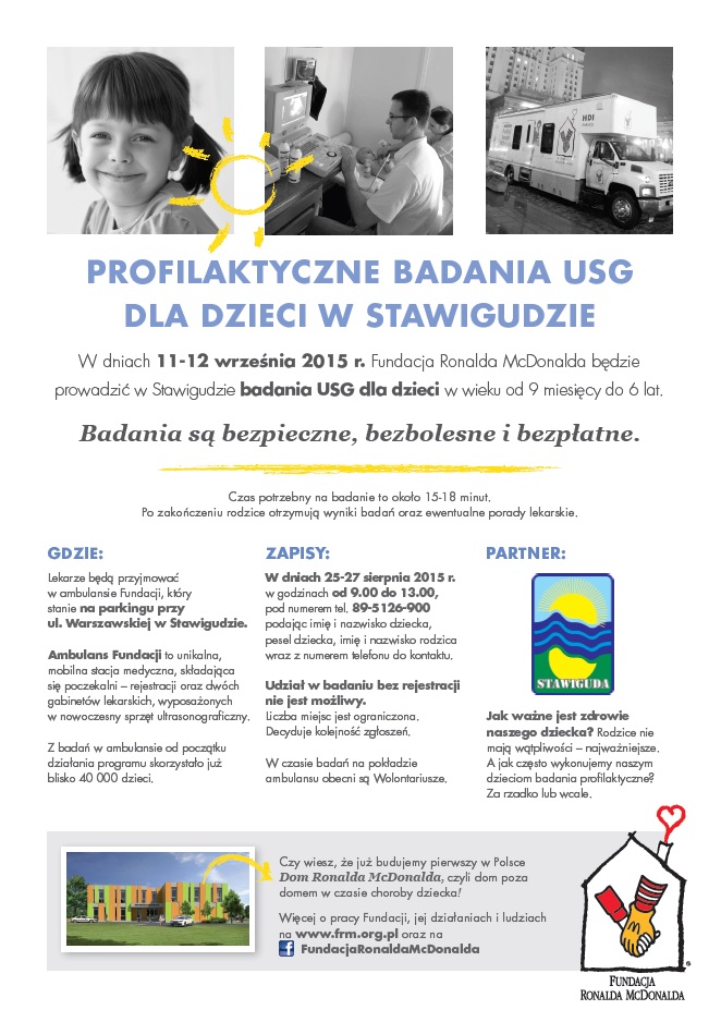 W dniach 11 – 12 września 2015 r. Fundacja Ronalda McDonalda będzie prowadzić w Stawigudzie badania ultrasonograficzne dla dzieci w wieku od 9 miesięcy do 6 lat. Badania są bezpieczne, bezbolesne i bezpłatne.
