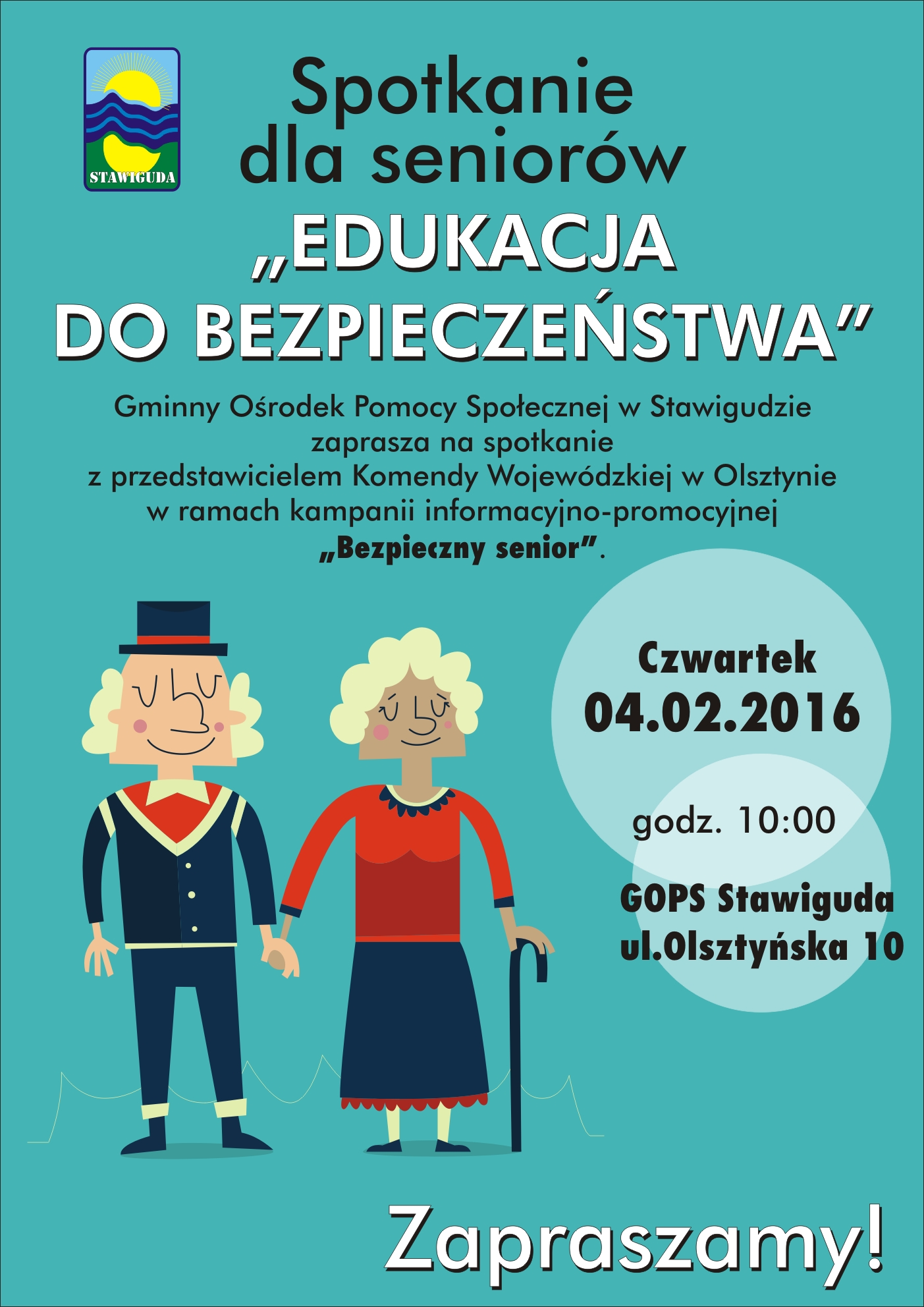Spotkanie dla seniorów :Edukacja do bezpieczeństwa", Gminny Ośrodek Pomocy Społecznej w Stawigudzie zaprasza na spotkanie z przedstawicielem Komendy Wojewózkiej w Olsztynie w ramach kampanii informacyjno-promocyjnej "Bezpieczny senior"