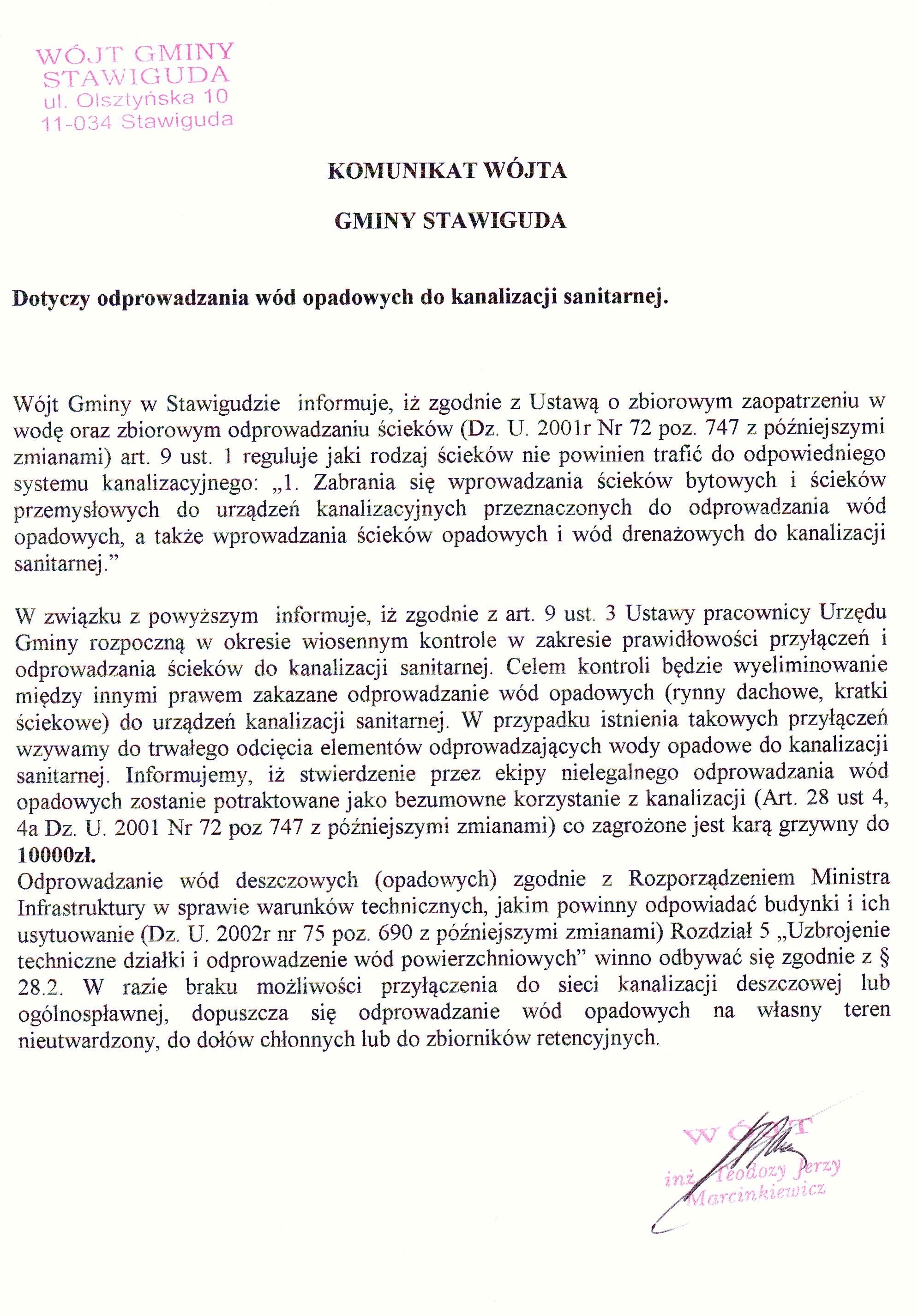 Komunikat Wójta - odprowadzanie wód opadowych do kanalizacji sanitarnej