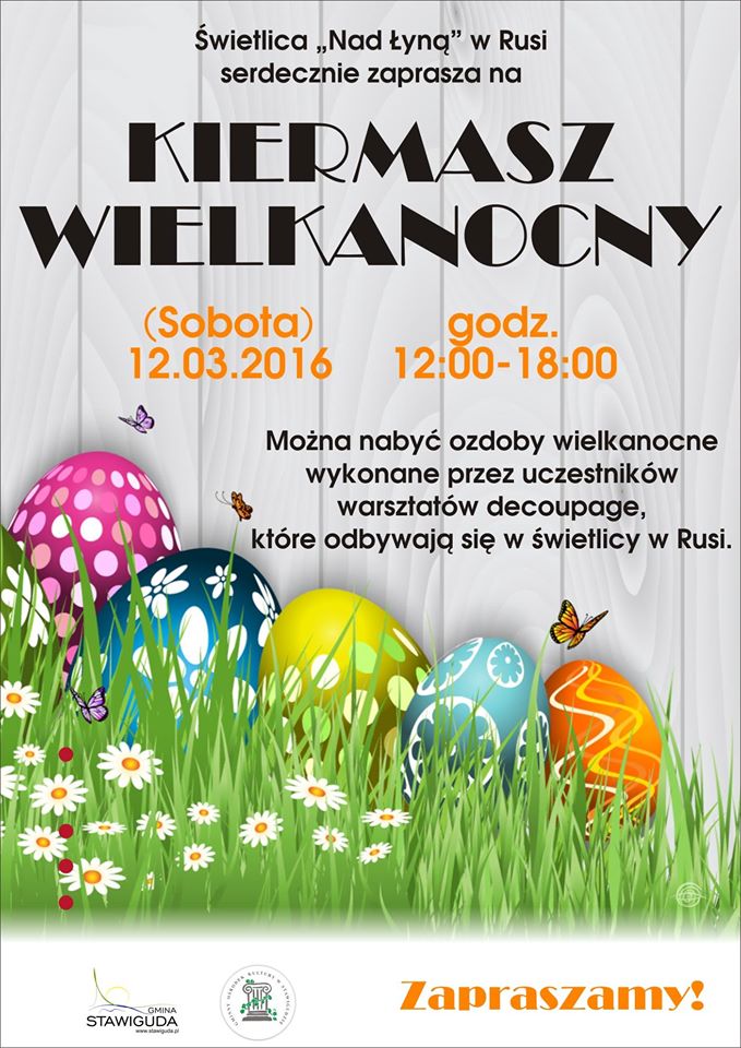 Świetlica "Nad Łyną" w Rusi serdecznie zaprasza na Kiermasz Wielkanocny, który odbędzie się 12.03.2016 (sobota) w godzinach 12:00-18:00.