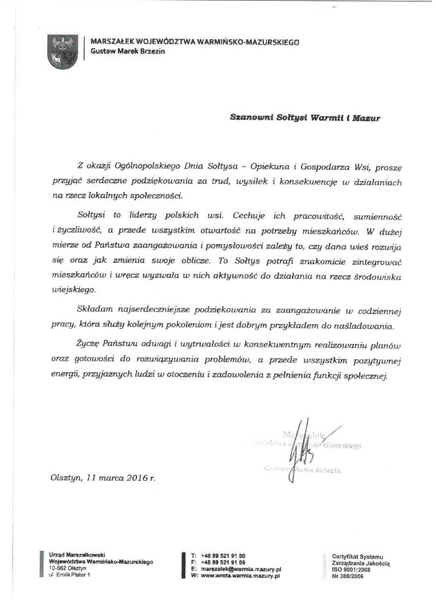 Z okazji Ogólnopolskiego Dnia Sołtysa - Opiekuna i Gospodarza Wsi, proszę przyjąć srdeczne podziękowania za trud, wysiłek i konsekwencję w działaniach na rzecz lokalnych społeczności.