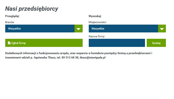 Informacja dla przedsiębiorców z terenu Gminy Stawiguda: na stronie http://www.stawiguda.pl/katalog-firm została uruchomiona wyszukiwarka firm.  Prosimy o korzystanie z opcji "Zgłoś firmę" i dodawanie swoich firm. Można dodawać logo firmy i zdjęcia. Po zgłoszeniu i weryfikacji, informacja o przedsiębiorstwie pojawia się już na stronie.