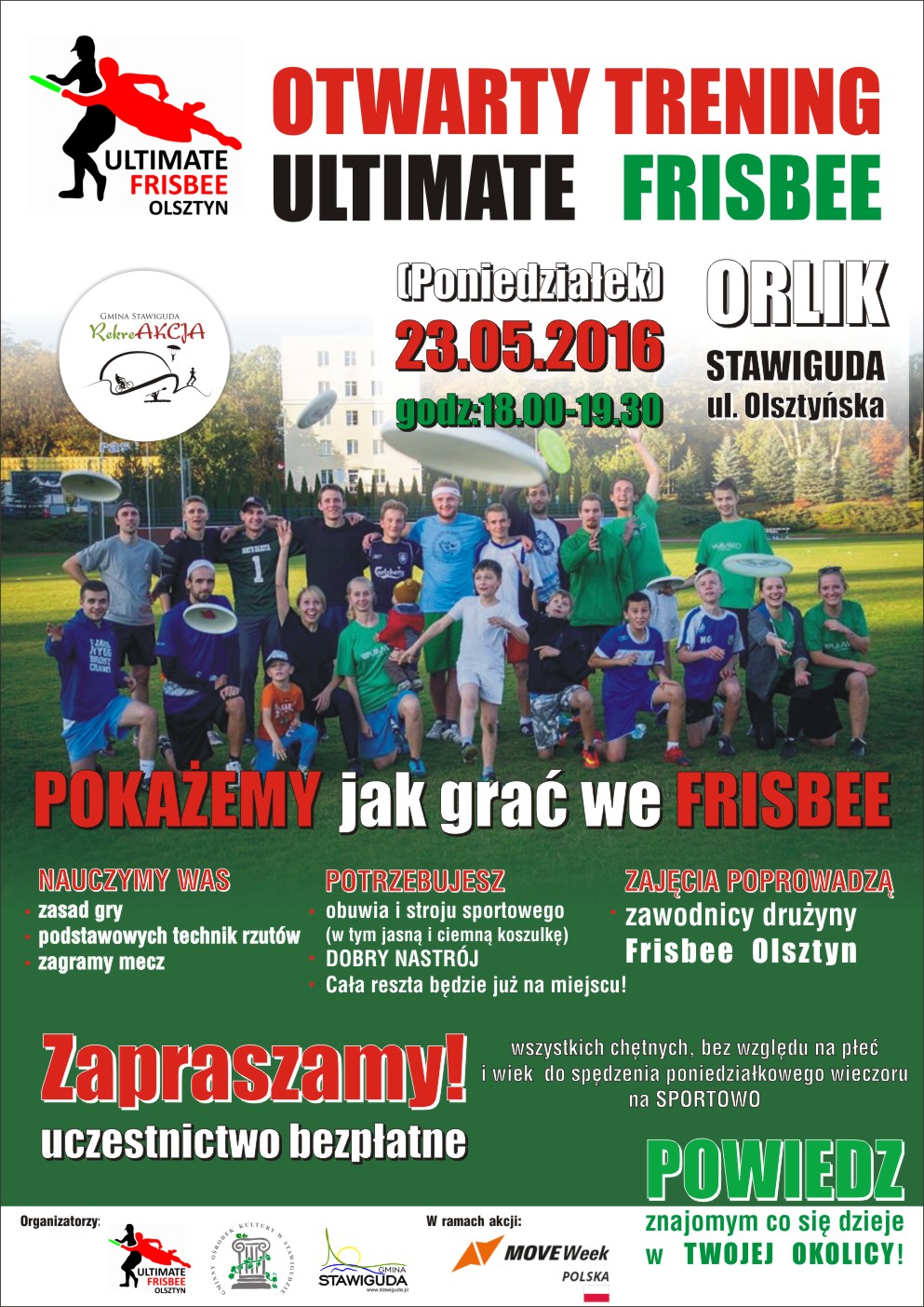 W poniedziałek 23.05.2016 roku w godzinach 18:00-19:30 na orliku w Stawigudzie odbędzie się otwarty trening Ultimate Frisbee!
