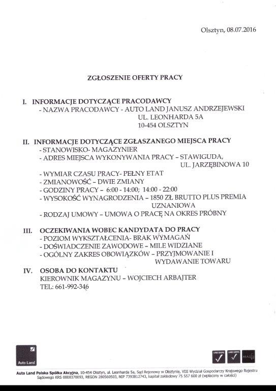 AUTO LAND poszukuje osoby na stanowisko pracy - magazynier...
