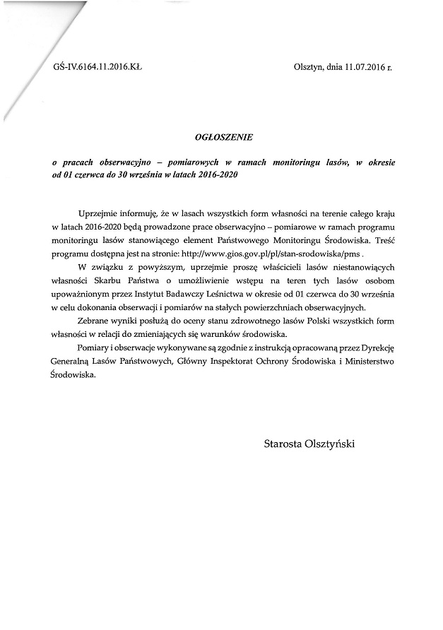 Ogłoszenie o pracach obserwacyjno - pomiarowych w ramach monitoringu lasów, w okresie od 01 czerwca do 30 werześnia w latach 2016-2020.