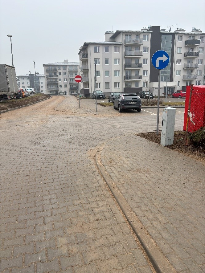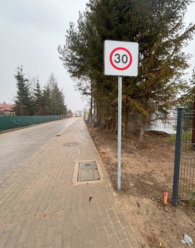 Dla zapewnienia bezpieczeństwa użytkowników drogi zostanie zastosowane odpowiednie oznakowanie zgodnie z Projektem Organizacji Ruchu (w tym przejście dla pieszych, próg zwalniający, ograniczenie prędkości).