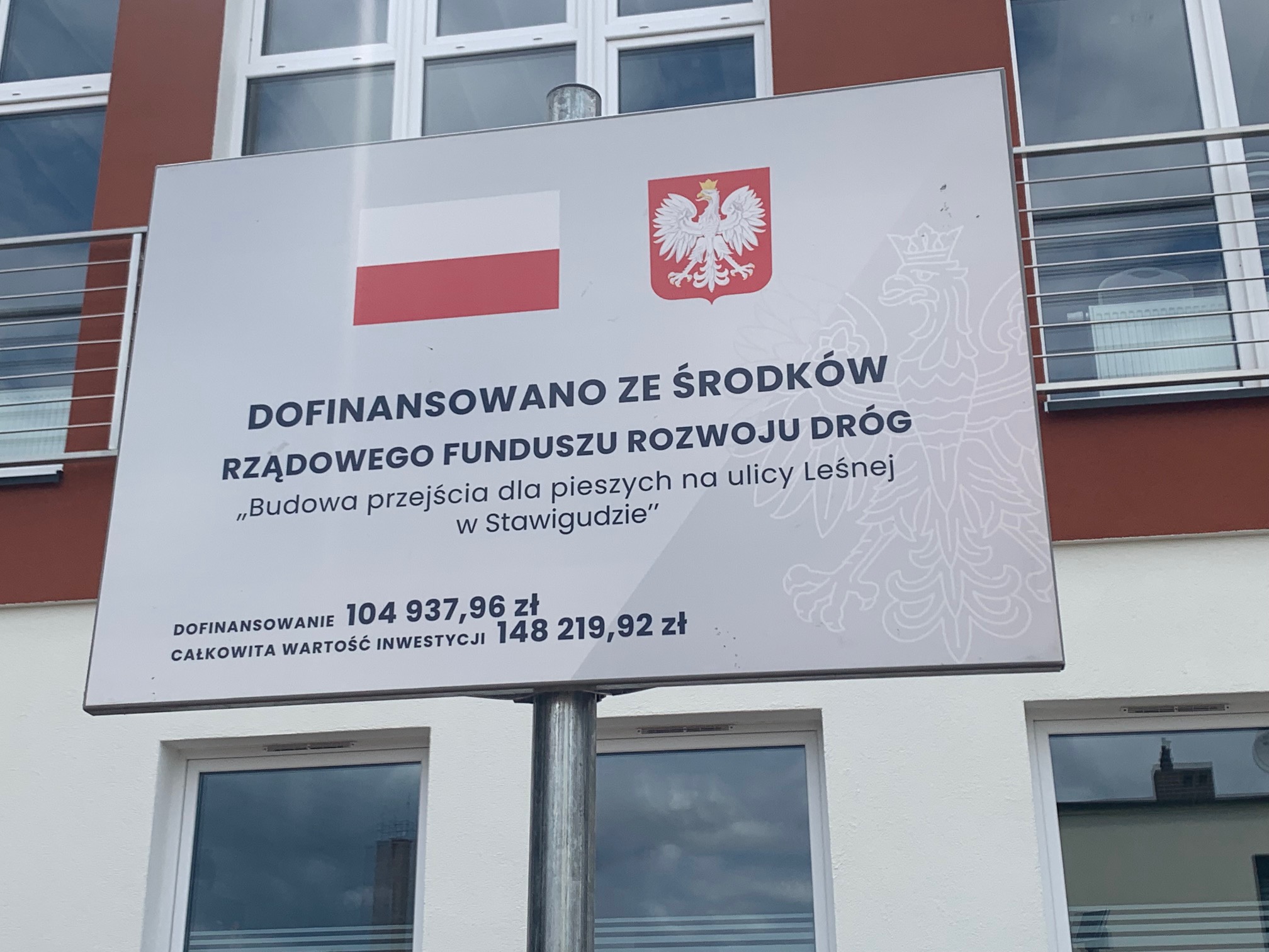 Przedmiotem zadania jest budowa wyniesionego przejścia dla pieszych w miejscowości Stawiguda w ciągu drogi gminnej 162079N ulicy Leśnej na działce nr 300 w okolicy skrzyżowania z ulicą Mazurską. Przy przejściu zaprojektowano aktywne punkty świetlne pługoodporne w jezdni tzw.: „kocie oczka”, maty antypoślizgowe, linie warunkowego zatrzymania oraz linię rozgraniczającą pasy ruchu w obrębie oddziaływania przejścia dla pieszych. Dojścia i strefy oczekiwania zostały wyposażone w system informacji fakturowej. Dojścia do przejścia zostały przebudowane pod kątem dostosowania wysokości nawierzchni. Przejście zostało doświetlone dodatkowym dedykowanym oświetleniem a oznakowanie pionowe uzupełnione sygnalizacją ostrzegawczą.