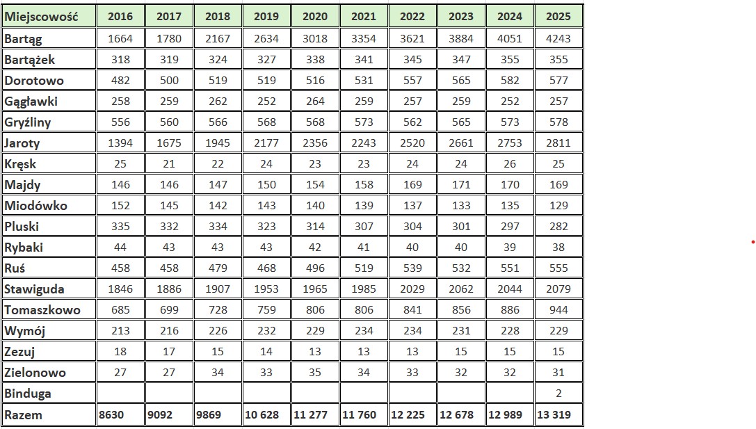 Zestawienie liczby mieszkańców wg stanu na dzień 31 grudnia 2025 roku w Gminie Stawiguda.
