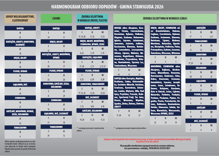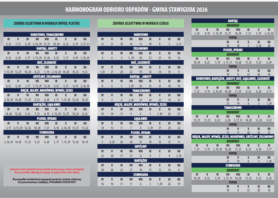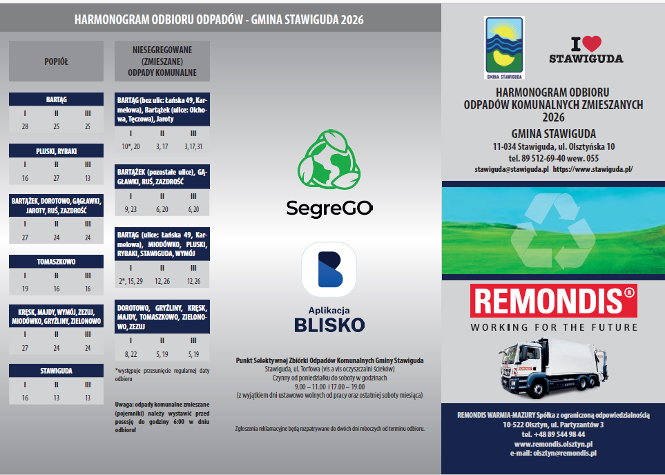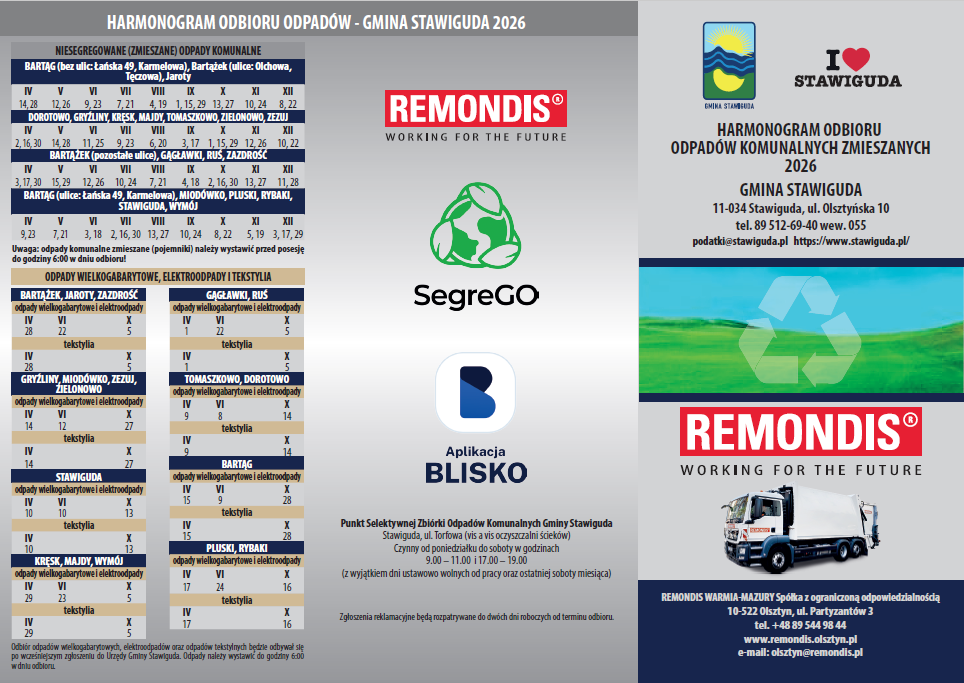 Informujemy, że odbiorem i transportem odpadów komunalnych od właścicieli nieruchomości zamieszkałych oraz nieruchomości wykorzystywanych na cele rekreacyjno-wypoczynkowe na terenie Gminy Stawiguda w okresie od 01.04.2026 r. do 31.12.2027 r. zajmuje się firma REMONDIS WARMIA-MAZURY Sp. z o.o. z siedzibą w Olsztynie (10-522) ul. Partyzantów 3. Dane kontaktowe firmy: tel. 89 544-98-12 lub 89 544-98-01 e-mail: