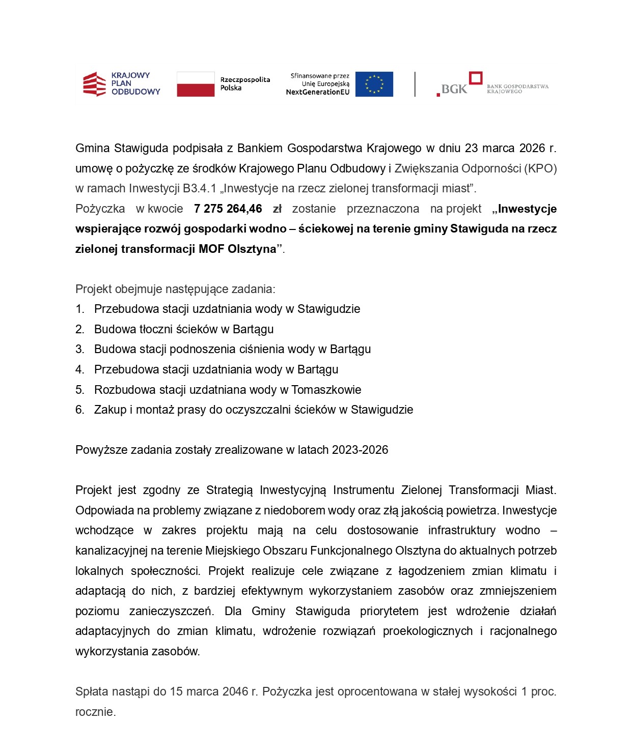 „Inwestycje wspierające rozwój gospodarki wodno – ściekowej na terenie gminy Stawiguda na rzecz zielonej transformacji MOF Olsztyna”.
