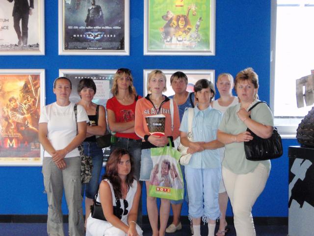 W ramach kontraktu socjalnego uwzględniliśmy dwa wyjścia do kina: Pierwsze z nich wyznaczyliśmy na 29.07.2008r. Grupa z opiekunem wybrała się na film pt.”Moja dziewczyna wychodzi za mąż”. Drugie natomiast zaplanowaliśmy na 22.08.2008. Uczestnicy projektu „Zrealizuj siebie” wraz z opiekunem pojechali do kina na film „Chłopaki też płaczą”. W/w wyjścia miały być zachętą do dalszego uczestnictwa w kulturze, zapomnienia o codzienności i sposobem wypełnienia wolnego czasu. To także nauka przebywania i funkcjonowania w grupie. Tytułowe filmy to przykłady odrzucenia funkcjonujących w społeczeństwie stereotypów, które kursanci mieli możliwość zaobserwować i odnieść do własnego życia. Z zainteresowaniem obserwowali perypetie głównych bohaterów , których losy były trudne do przewidzenia. Po seansie chętnie podjęli dyskusję odnośnie oceny postępowania bohaterów. Starali się utożsamiać z ich sytuacją w jakiej się znaleźli , kiedy trzeba było oceniali zachowanie bohaterów w sposób krytyczny. Widoczna była tu u niektórych wrażliwość na tragedie życiowe i cierpienie ludzkie.