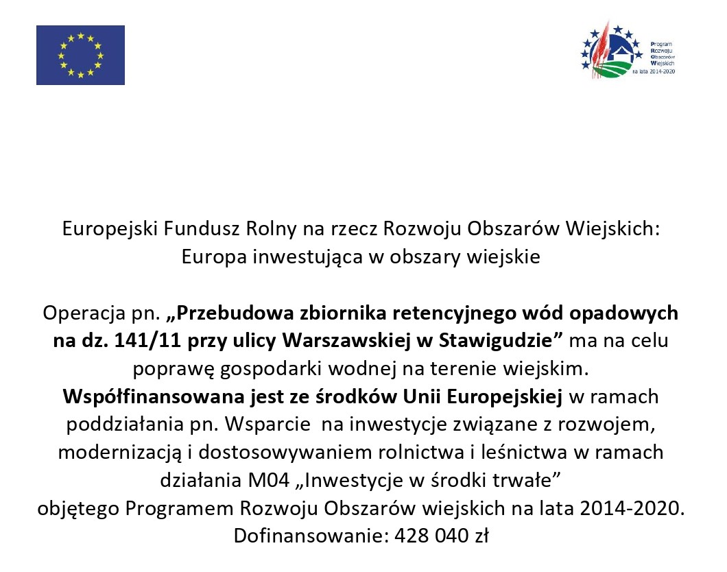 „Przebudowa zbiornika retencyjnego wód opadowych na dz. 141/11 przy ulicy Warszawskiej w Stawigudzie”
