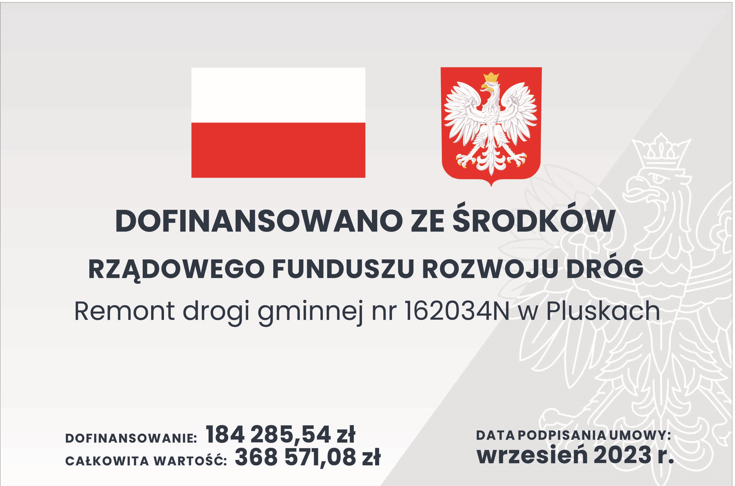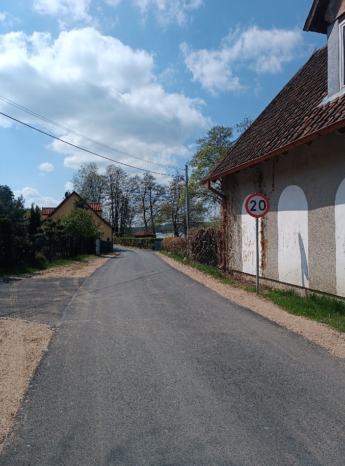 Remont drogi gminnej nr 162034N w Pluskach polegał na położeniu nowej warstwy asfaltowej na długości 270 m. Zakres robót remontowych objął frezowanie istniejącej nawierzchni, położenie wraz z wyprofilowaniem nowej warstwy bitumicznej, uzupełnienie obustronnych poboczy gruntowym kruszywem łamanym, remont istniejących zjazdów, dla potrzeb odwodnienia w obrębie drogi wykonano odpowiednie spadki podłużne i poprzeczne w celu odprowadzenia wody na tereny zielone. Zastosowanie ograniczenia prędkości do 20 km/h - oznakowania B -33 - 1 szt, zgodnie z projektem organizacji ruchu. Bezpieczeństwo poprawia próg zwalniający.