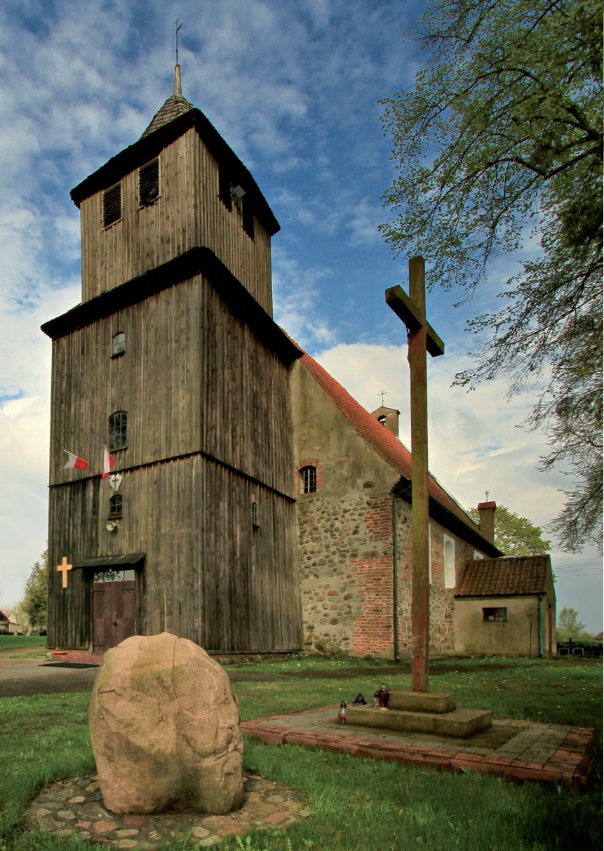 roku konsekrował biskup warmiński, Marcin Kromer. W wewnętrzne ściany świątyni wmurowane zostały dwa kamienie młyńskie i rzeźbione w cegle twarze. Późnobarokowy ołtarz główny pochodzi z ok. 1740 roku, ołtarze boczne zaś z XVIII wieku. Ambona