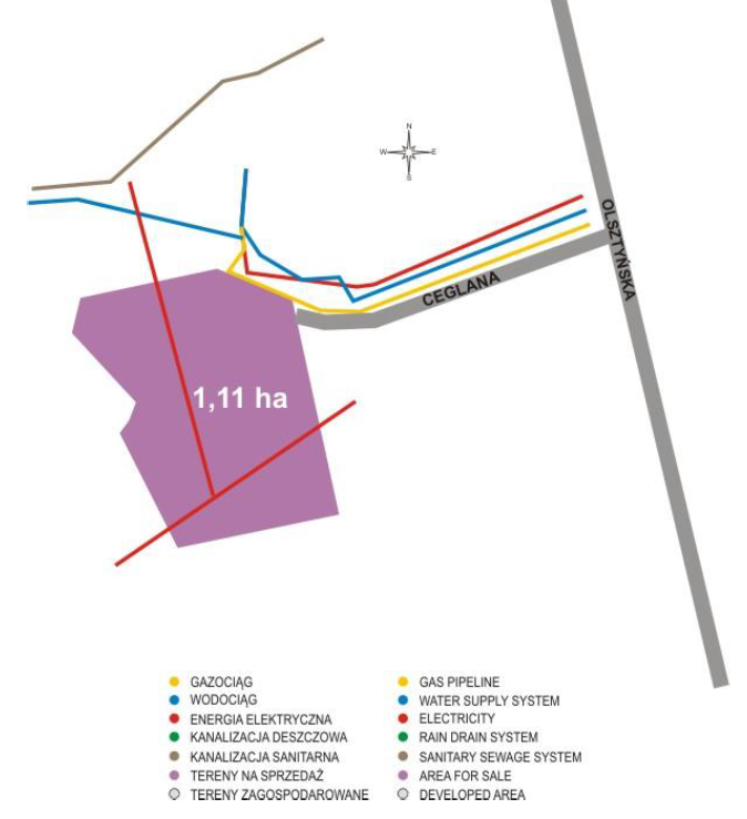 | Access road to the plot (type and width of access road) | Olsztyńska street with bituminous pavement: 9 m | ||