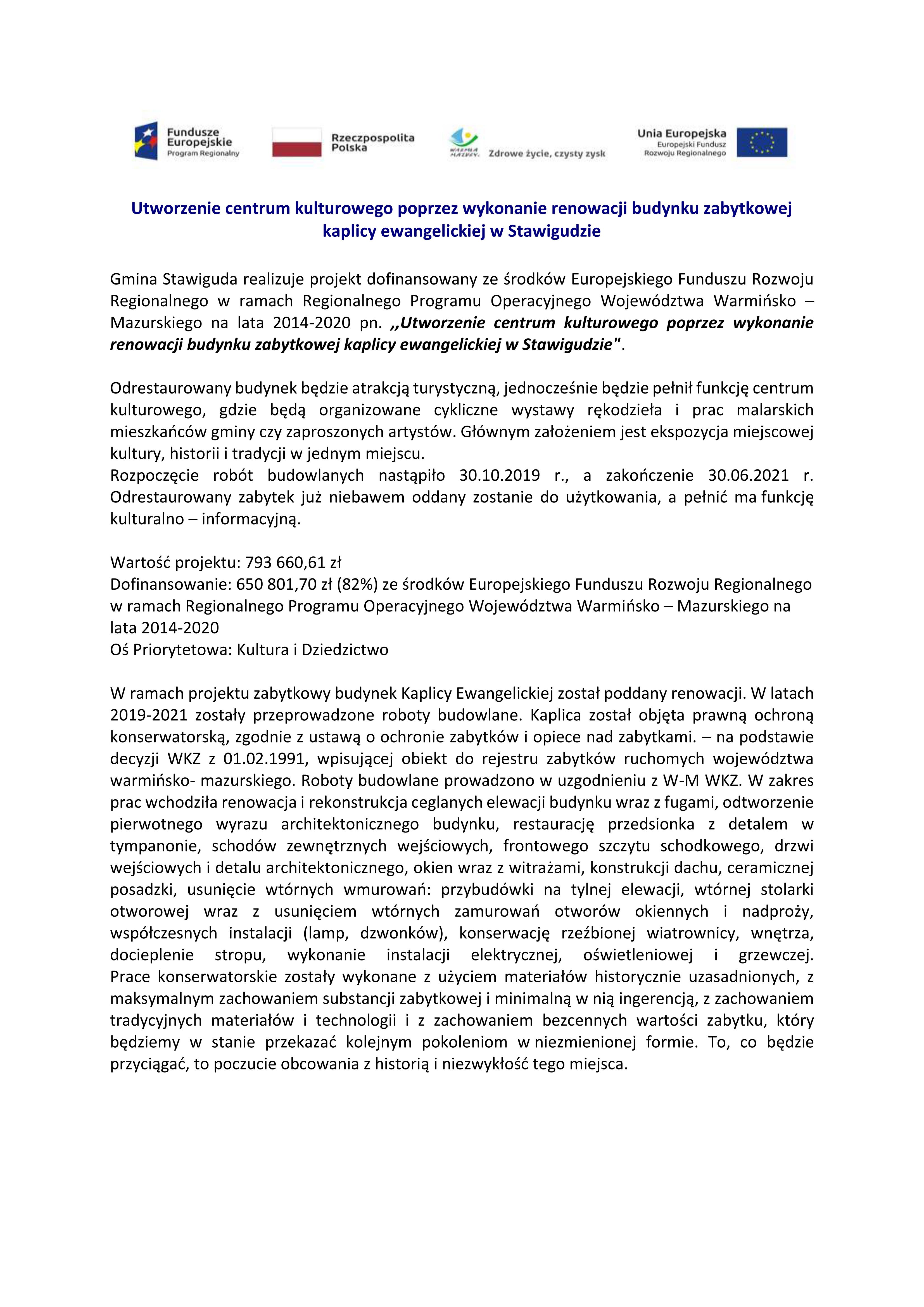Utworzenie centrum kulturowego poprzez wykonanie renowacji budynku zabytkowej kaplicy ewangelickiej w Stawigudzie